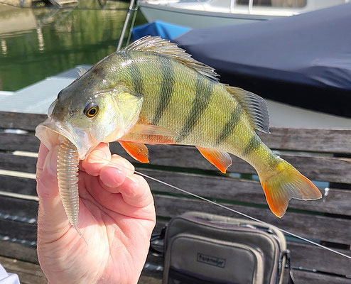 Bestückt mit einem leichten 6/0er Jighaken wird bevorzugt der Classy Shad „Forelle“ mit einer Länge von 15,5cm langsam entlang des ufernahen heißen Bereiches eingeholt…, und RUMMS!