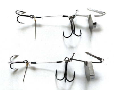 Falls die Strömung zu stark sein sollte, ihr keinen Grundkontakt bekommen könnt, dann 2 Blinker als „Sandwich“ übereinander legen, und schon habt ihr eine schwerere Ausführung parat! Warum ein Einzelhaken? Zum einen verringert es die Hängergefahr beim Grund-nahen Abfischen der Stelle, und zum anderen verringert es auch die Verletzungsgefahr für euch beim Abhaken des Fisches. Hierzu noch ein Tipp für die Drilling-Fans: legt mal einen Drilling und einen entsprechenden Einzelhaken übereinander, allein die Größe des Hakenbogens des E-Hakens sollte als Antwort reichen… Auch die Blinker von „Blinker-Jörg“ sind eine Bank am Fluss, vor allem der Neckar Blinker und der Rasselblinker. Natürlich könnt ihr auch mit Gufis angeln, am besten Doppelschwanz-Twister oder die gute alte „Sandra“ seien hier genannt! Wie schon oben geschrieben, ich bin im frühen Frühjahr eher für Heavy Metal!